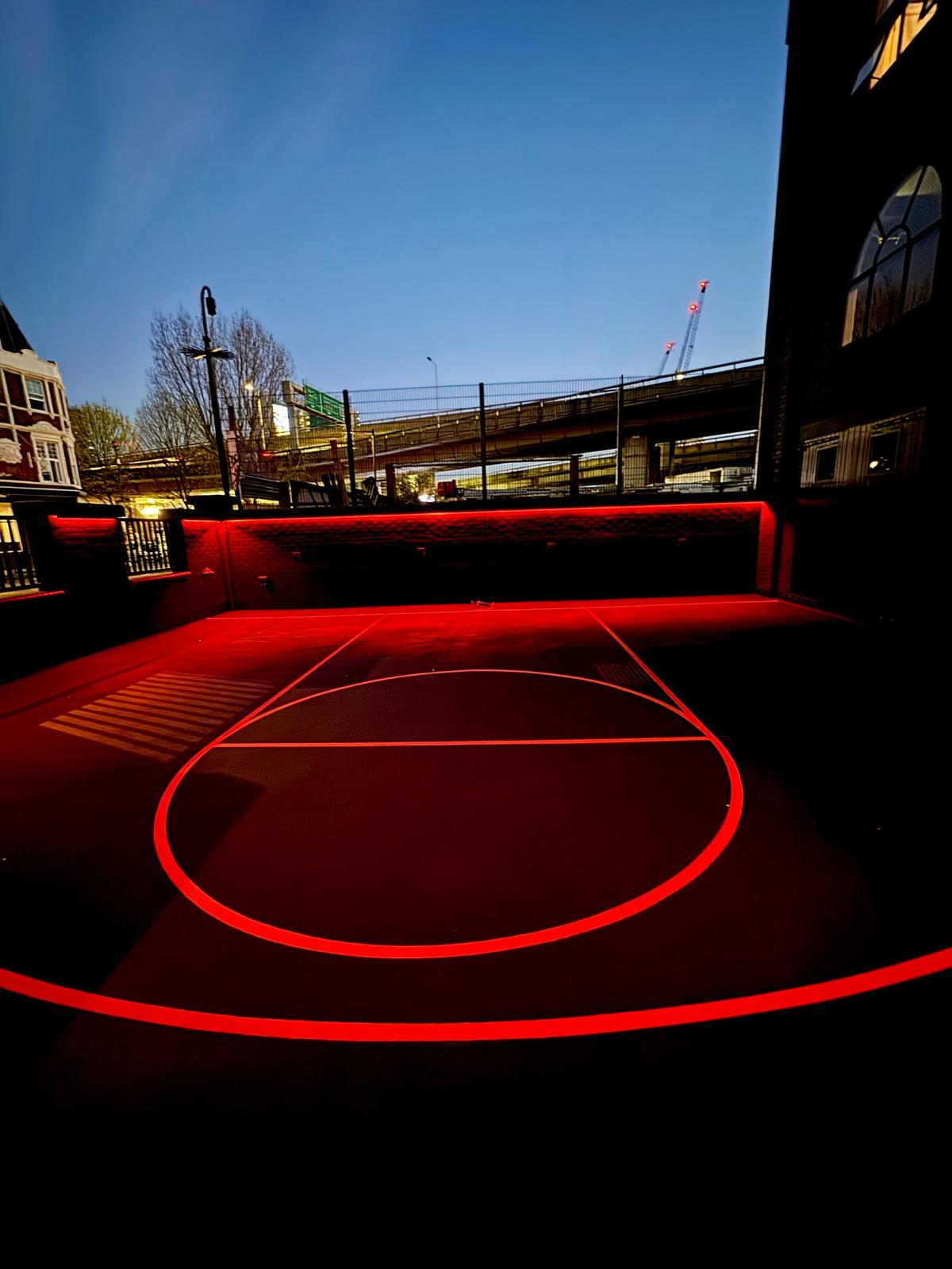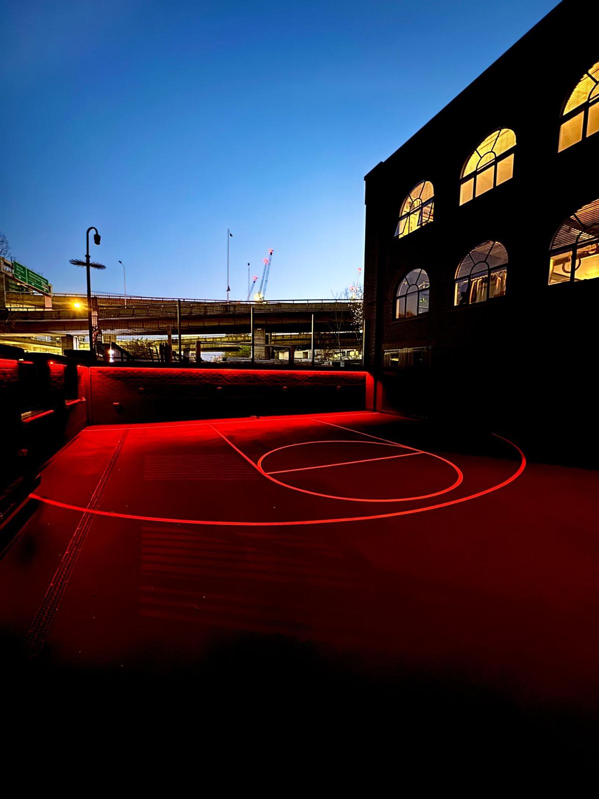 Inside the building, the cars, artwork and arcade machines create atmosphere. Outside, the new basketball court now does the same.