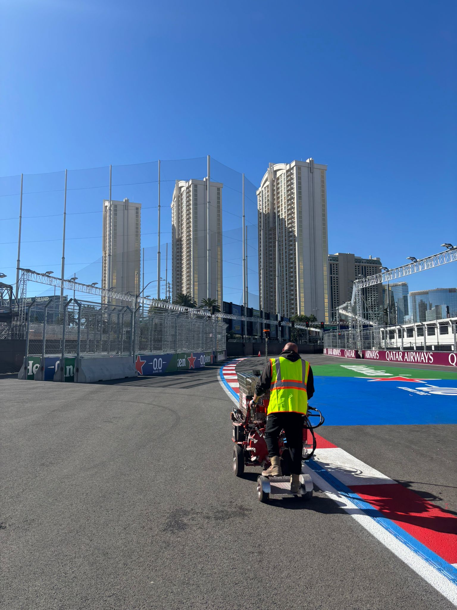 Preparing Las Vegas for Formula 1 requires a unique balance: the city must continue functioning as normal while slowly morphing into a high-speed street circuit. That transformation begins with cold track striping where we adapt everyday road markings to suit temporary traffic flows, pedestrian routes and safety features for when the race barriers go in.