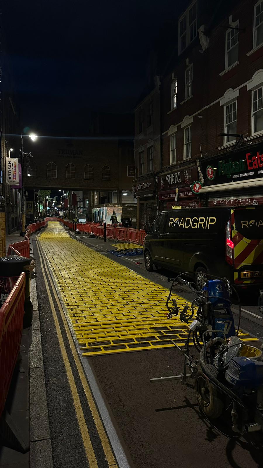 To create the effect, we first sprayed the entire stretch of road brown, providing the perfect ‘grouting’ colour to define each brick. Then, using hand-cut plywood stencils meticulously crafted by one of our own operatives, we sprayed the individual yellow bricks in place. The result was a seamless, bold, and textured pattern that looked as if it had been lifted straight from the Land of Oz.